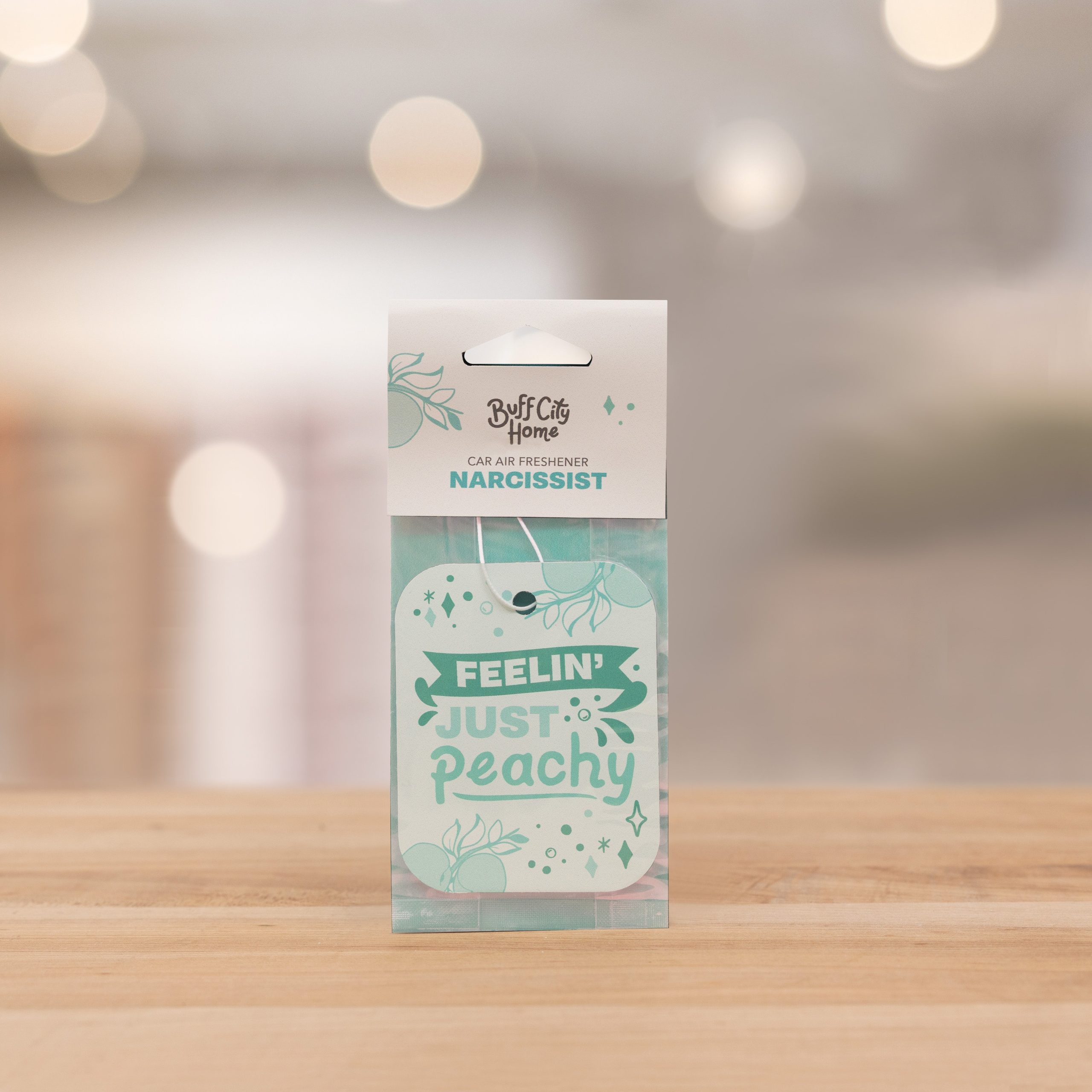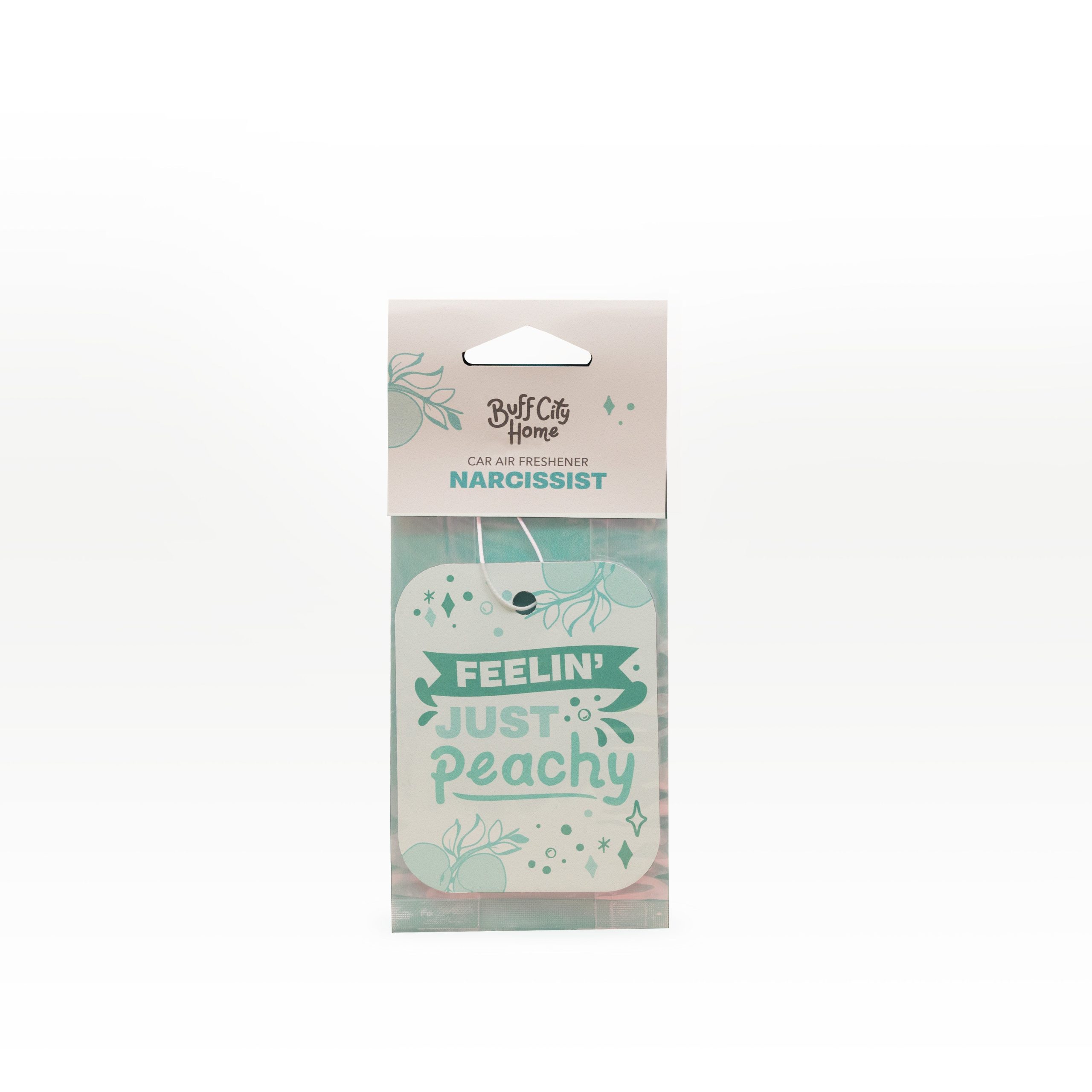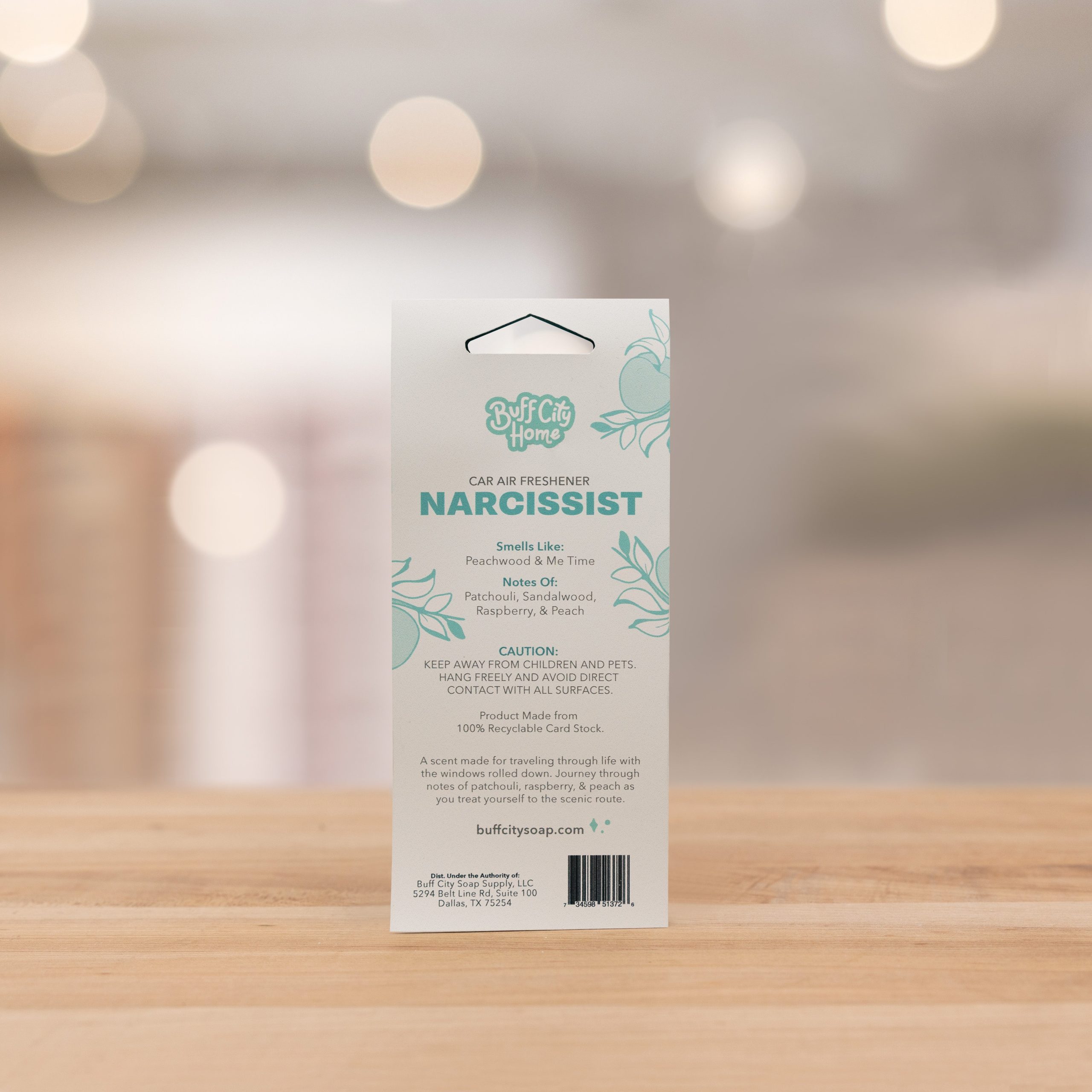 Narcissist Car Air Freshener A scent made for traveling through life with the windows rolled down. Journey through notes of patchouli. raspberry. & peach as you treat yourself to the scenic route.